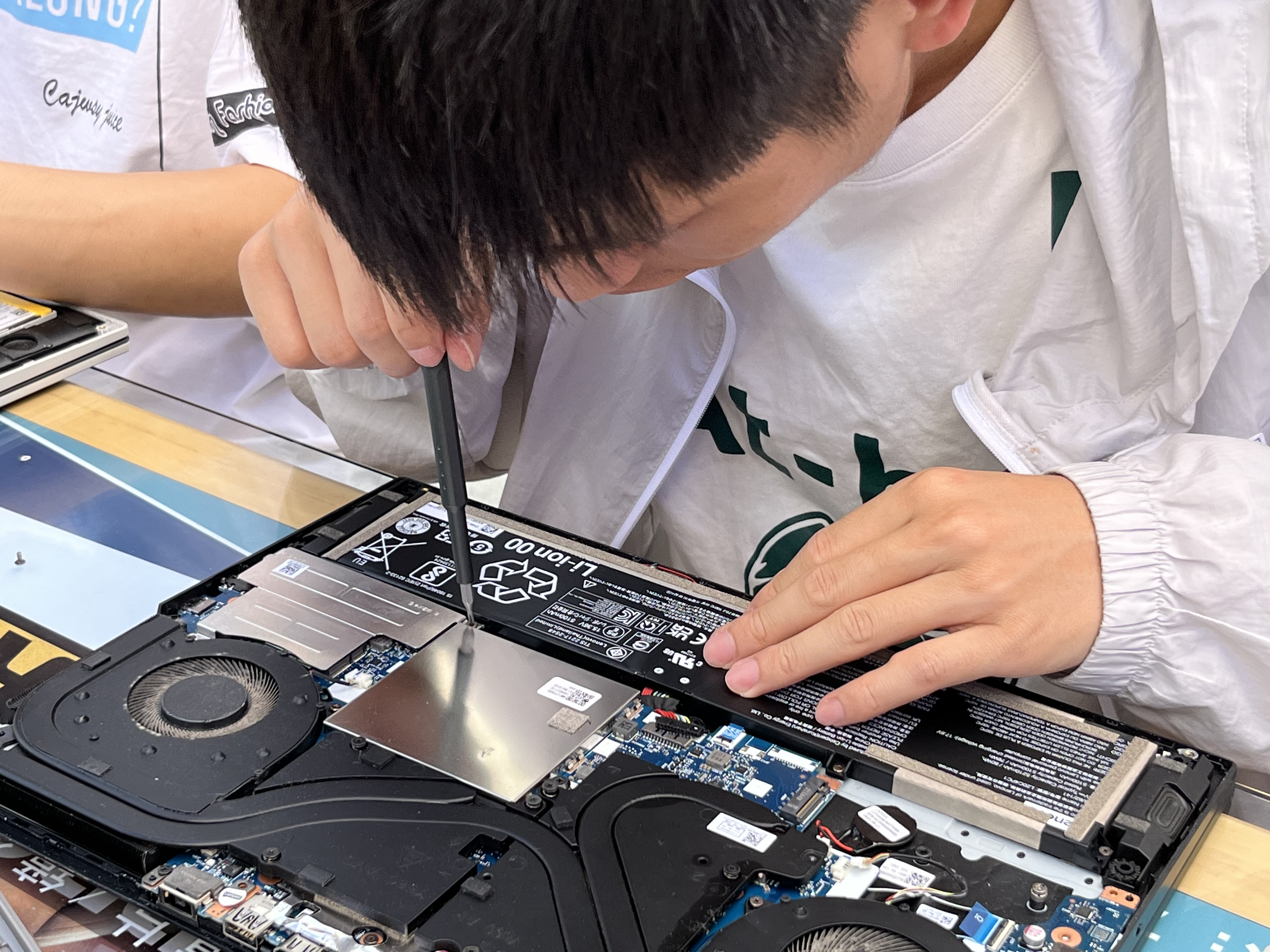 早上刚一出摊,就吸引了很多同学前来询问,在维修的同时,“自强小匠”还为同学们解答各式各样的问题,并为不熟悉电脑操作的同学提供技术指导,活动现场氛围热烈,“自强小匠”们忙得不亦乐乎。令人感动的是,往年的“自强小匠”学长学姐们也自发地来到摊位前,主动地支持这次活动,体现了员工懂感恩讲奉献的美好品质和公司自强精神的传承。