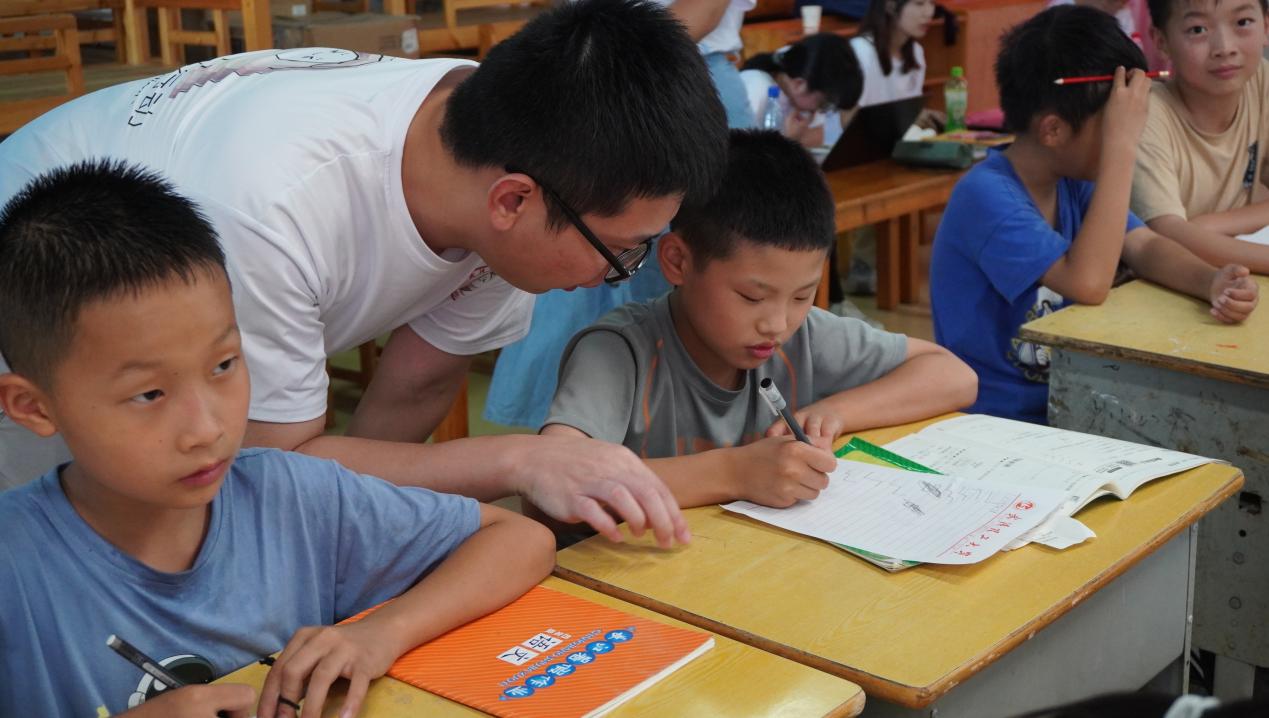图为石老师为小朋友们辅导课后作业