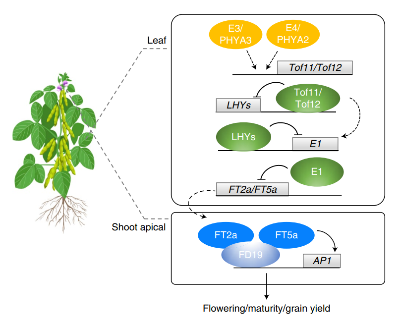 该研究利用大数据基因组学分析、生物信息学和经典正向遗传学相结合的方法,发掘了两个长日照条件下控制开花期的关键位点Tof11和Tof12。分子机制解析表明,Tof11和Tof12通过调控LHY和E1基因控制大豆光周期开花,建立了完整的光周期调控分子网络(图1)。研究同时发现,Tof11和Tof12发生了渐进式的变异和人工选择。其中,Tof12-1的功能缺失突变首先被强烈选择,使栽培品种的开花期和成熟期普遍提前;Tof11-1的功能缺失型突变的发生于Tof12-1之后,在Tof12-1遗传背景上再次受到选择,从而进一步缩短了栽培大豆的开花期和生育期,因此提高了栽培大豆的适应性和种植。该研究首次系统报道了作物驯化过程中开花期基因的进化与选择分子机制。