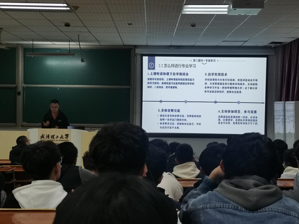 余志椋首先强调了专业学习重要性。他通过分析“绩点能为大家带来什么”,点明了专业学习对获得推免资格、获得荣誉称号的重要性。之后,对于如何进行专业学习,余志椋分享了自己的经验和技巧。他提醒大家课上专注和课下自学要相结合,主动寻找资源帮助学习;主动和任课老师沟通交流,有问题及时寻找老师的帮助;另外还要自学实用的技术,积极参与竞赛和科研项目,敢于实践和试错,才能锻炼专业能力、强化知识基础。